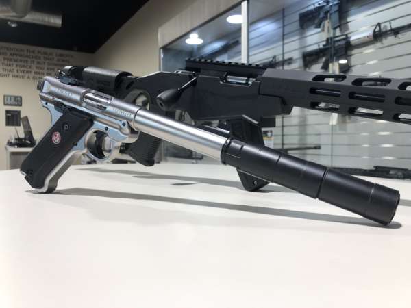 The Ruger Mark IV Target pictured here is a .22LR semi-automatic pistol. The Mark IV features a simple one-button takedown, ambidextrous manual safety, accurate sighting system that is drilled and tapped for weaver or picatinny mounting, and a 1/2″x28 threaded barrel for suppressors!