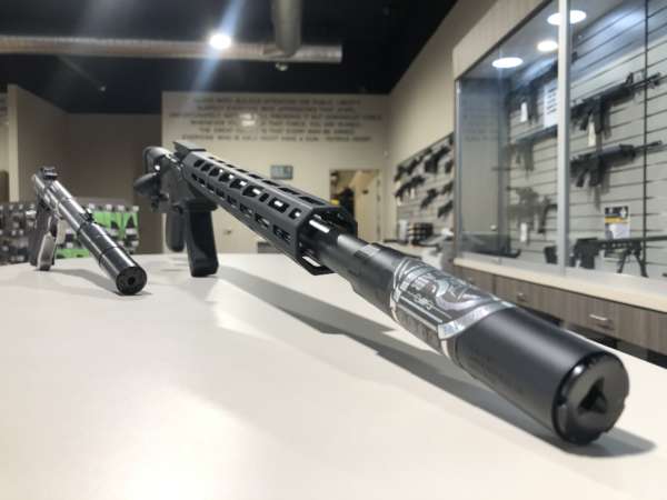 The suppressors shown are the Dead Air Silencers Mask 22 and the Rugged Suppressors Oculus 22.